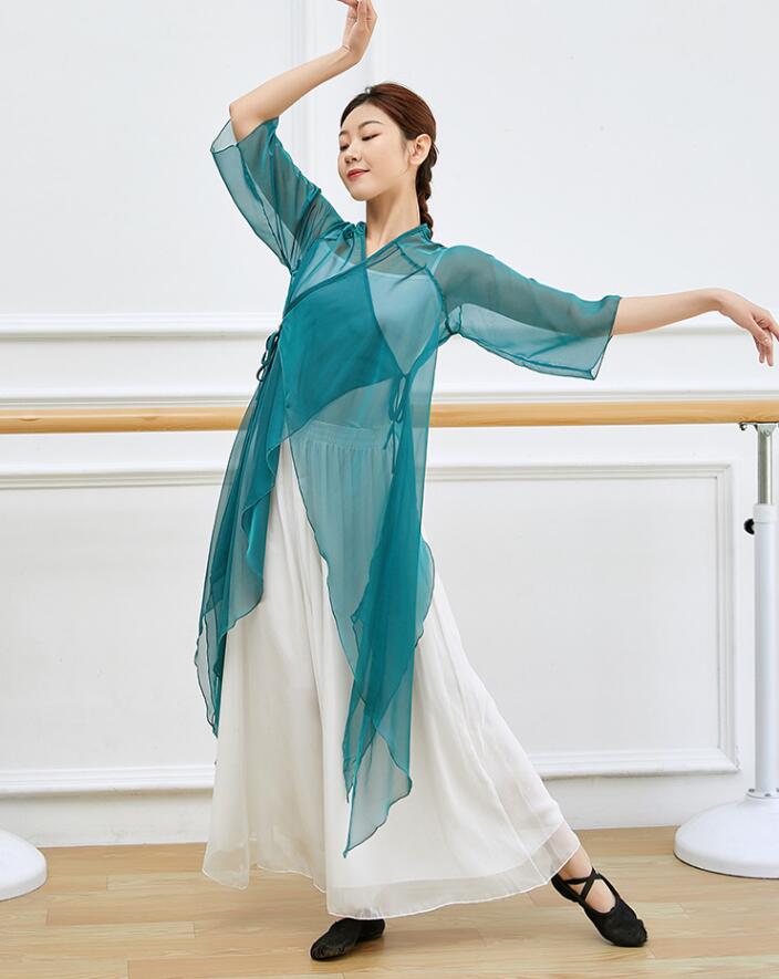 カーディガン シフォン ロング丈カーディガン レディースダンス衣装 エスニック 中華風 古典ダンス バレエ ヨガ 舞台演出服 練功服 シースルー カーディガン 交領 チャイナ服 イレギュラー裾