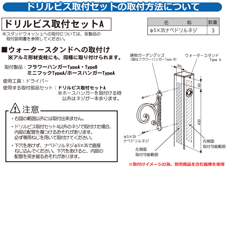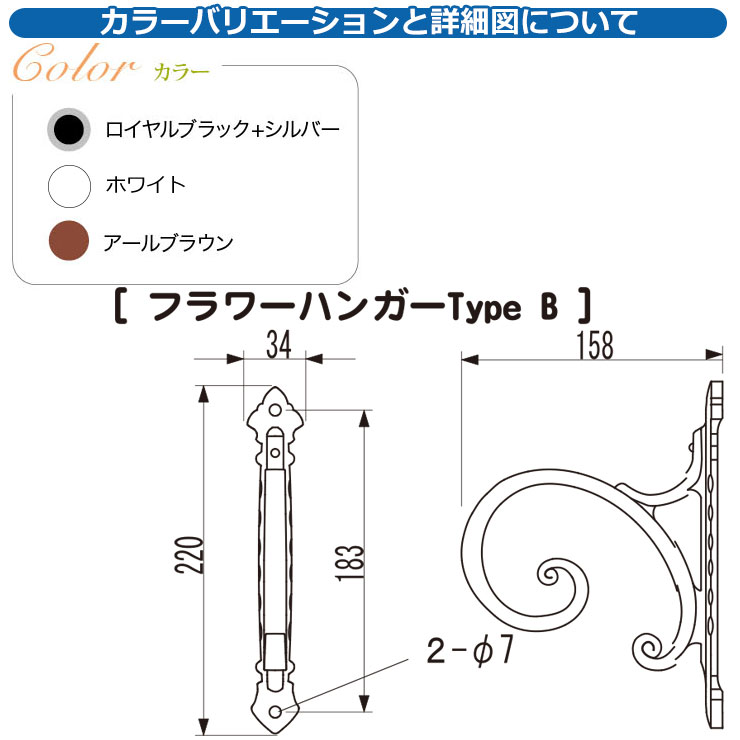 ディーズガーデン フラワーハンガー TypeB ドリルビス取付セット 小さな鉢を吊るすのにちょうどいいサイズのフラワーハンガー 販売条件 ◆詳しくはこちらをご確認ください カラー ・ロイヤルブラック+シルバー(3) ・アールブラウン(4) ・ホワイト(5) サイズ W34×H210×D158mm 材質 アルミ鋳物 仕様 オプションパーツ/耐荷重3kg 取付位置 ●取付場所:アルミ形材支柱/ウォータースタンドTypeA セット内容 ■フラワーハンガー TypeB ドリルビス取付セット 品番:DGG03A□ ※□にはカラー品番が入ります。